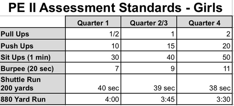 After the first two weeks, students perform a battery of baseline tests: timed mile run, sit-ups in 2 minutes, burpees in 1 minute, wall sit (5 minute max), plank (3 minute max), and push-ups to failure. Results are recorded. These tests are repeated each quarter, and students are expected to show improvement in the first 2 quarters and improvement or maintenance in the last 2 quarters. Testing in this way allows for the vast differences in ability and development at this age. Students are basically competing with themselves each quarter and challenged to push harder and improve their abilities in workouts throughout the quarter.